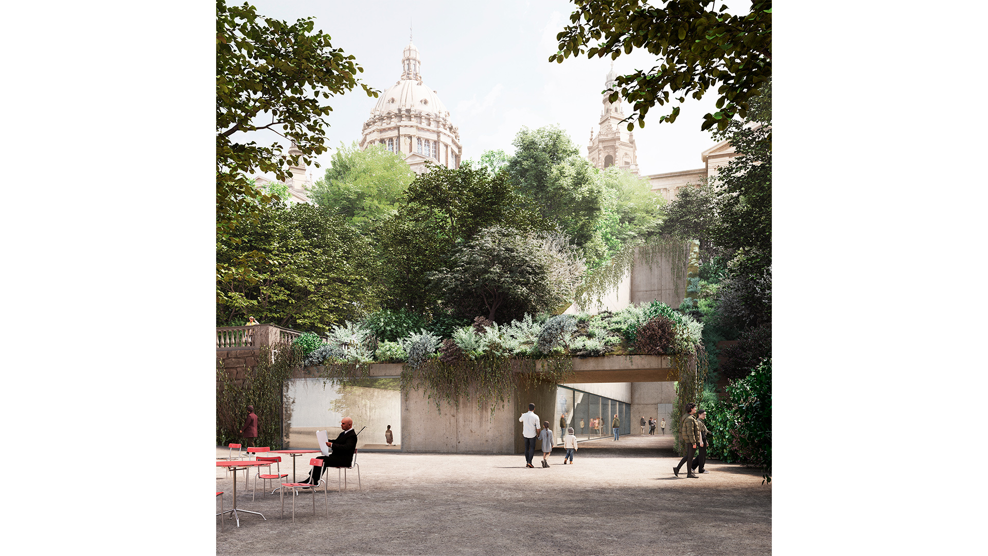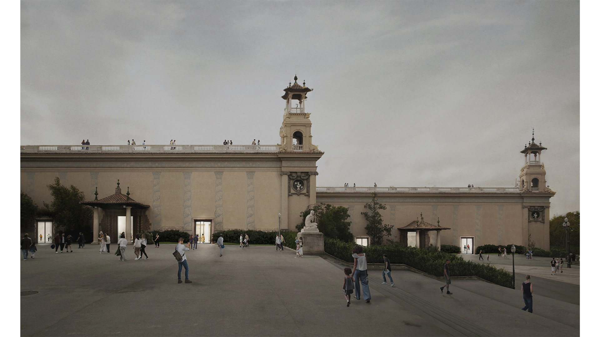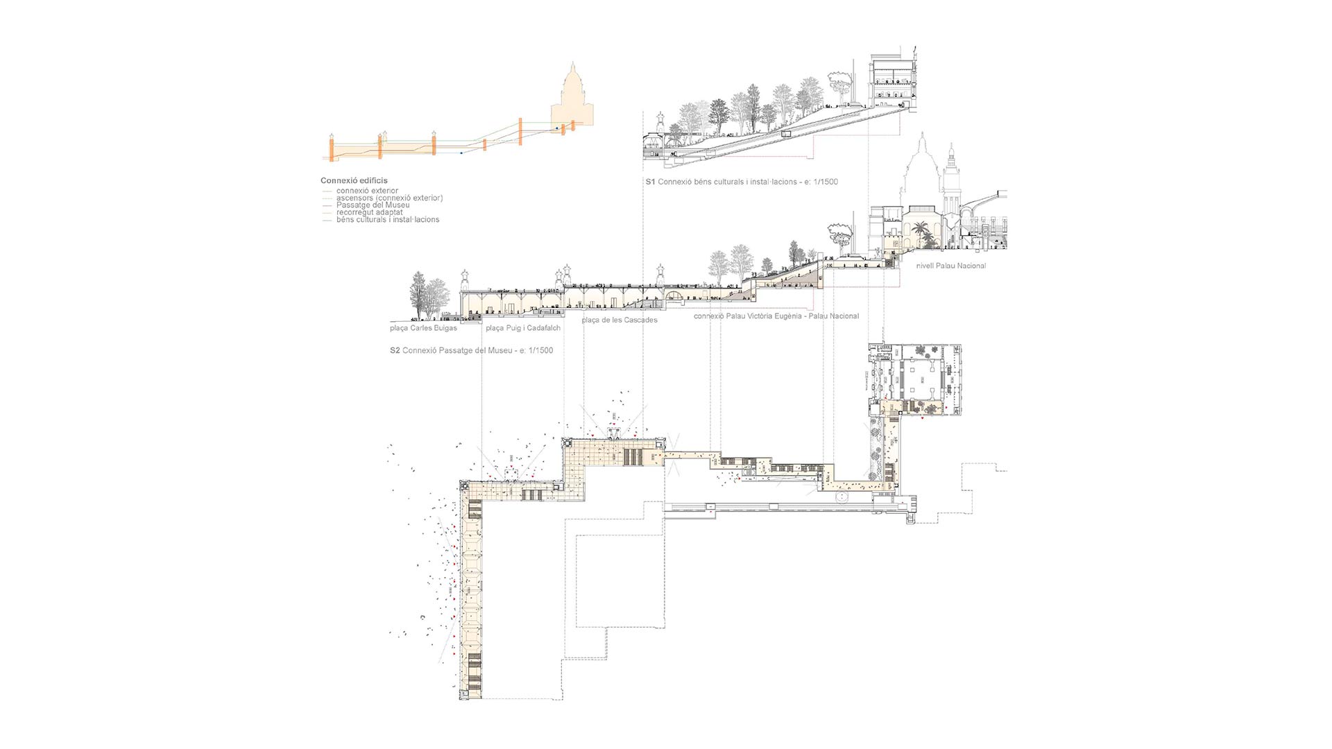 La proposta guanyadora concep el Palau Nacional i el Palau Victòria Eugènia com un únic Museu, mitjançant un passatge cobert que articula el conjunt d’espais, des del vestíbul d’accés del Palau Victòria Eugènia fins a l’interior del Palau Nacional. Aquesta intervenció no només amplia la superfície expositiva, sinó que culmina el projecte del Museu com a espai de representació de la creació artística a Catalunya i permet respondre als reptes i a les demandes de les diverses comunitats i dels agents de la societat i del sector cultural, alhora que reforça i amplia la seva vocació de servei públic. El projecte reconeix, igualment, la singularitat del Palau Victòria Eugènia i adapta l’edifici històric a les necessitats presents i futures del Museu.