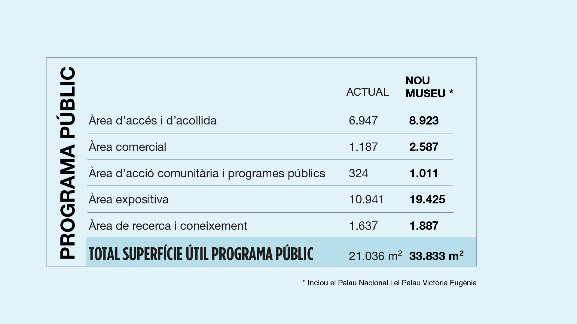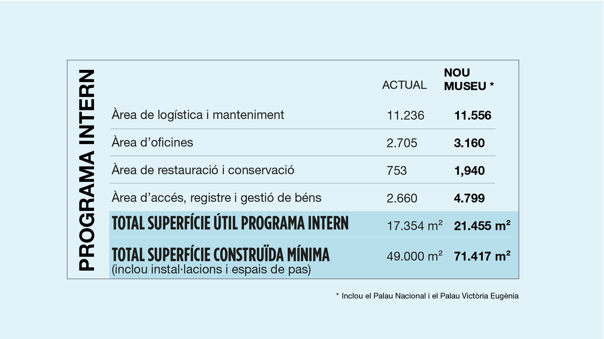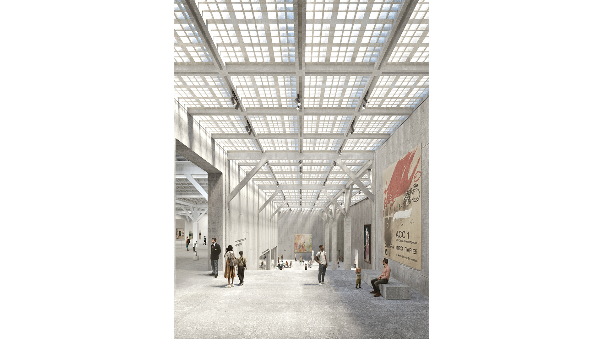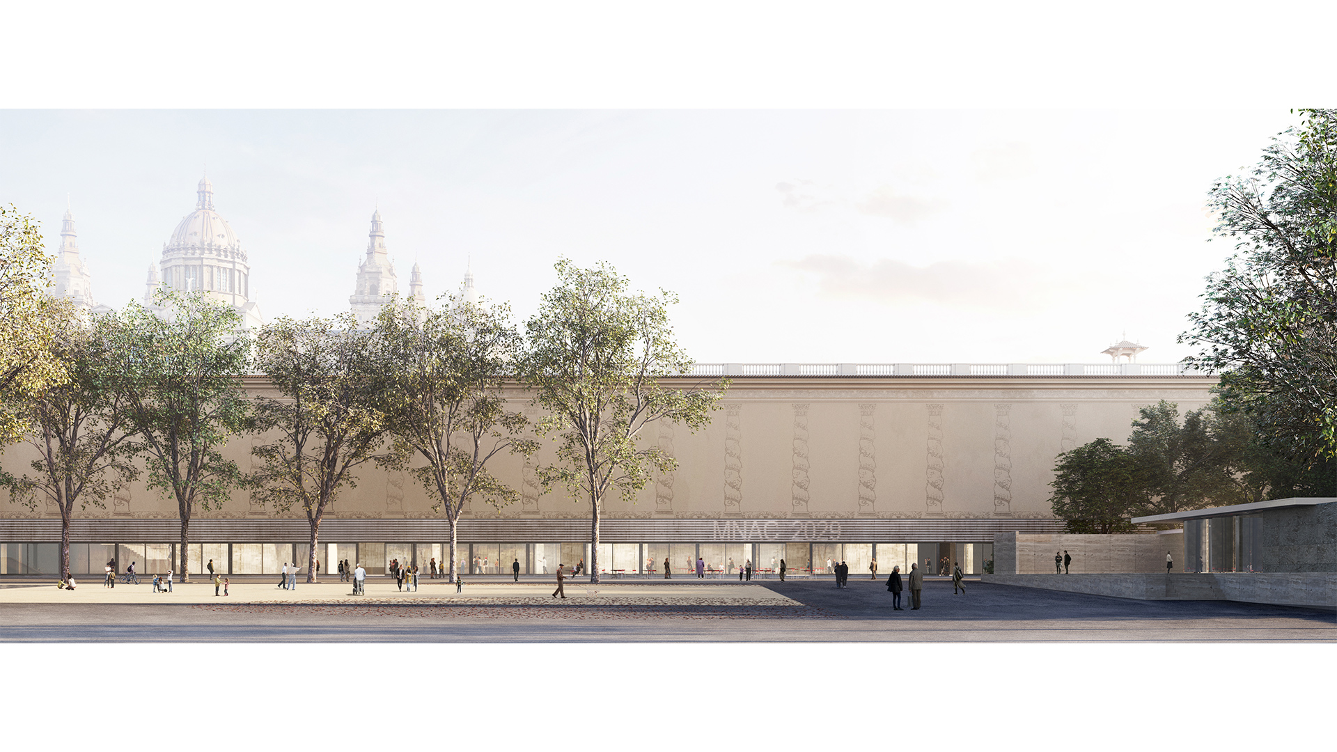 La proposta guanyadora concep el Palau Nacional i el Palau Victòria Eugènia com un únic Museu, mitjançant un passatge cobert que articula el conjunt d’espais, des del vestíbul d’accés del Palau Victòria Eugènia fins a l’interior del Palau Nacional. Aquesta intervenció no només amplia la superfície expositiva, sinó que culmina el projecte del Museu com a espai de representació de la creació artística a Catalunya i permet respondre als reptes i a les demandes de les diverses comunitats i dels agents de la societat i del sector cultural, alhora que reforça i amplia la seva vocació de servei públic. El projecte reconeix, igualment, la singularitat del Palau Victòria Eugènia i adapta l’edifici històric a les necessitats presents i futures del Museu.