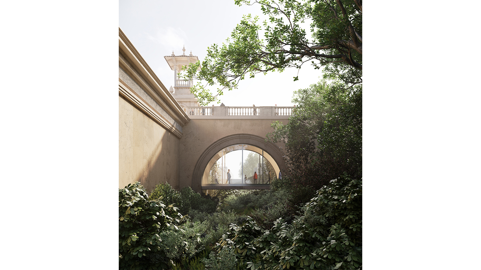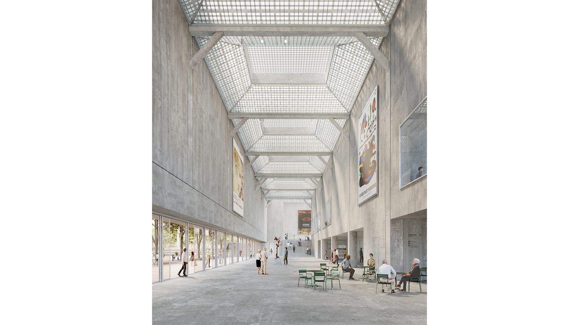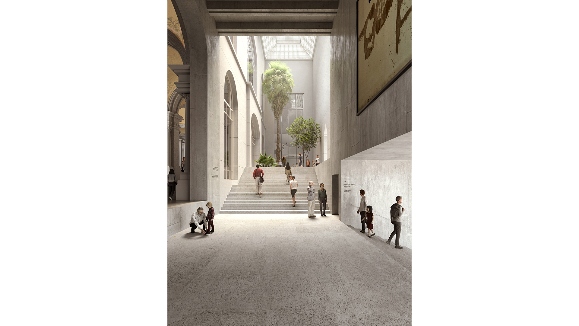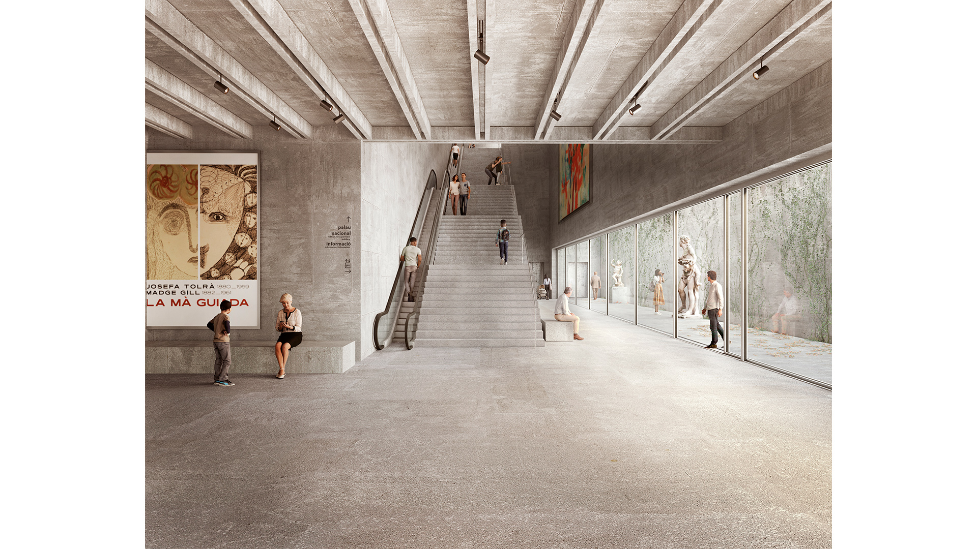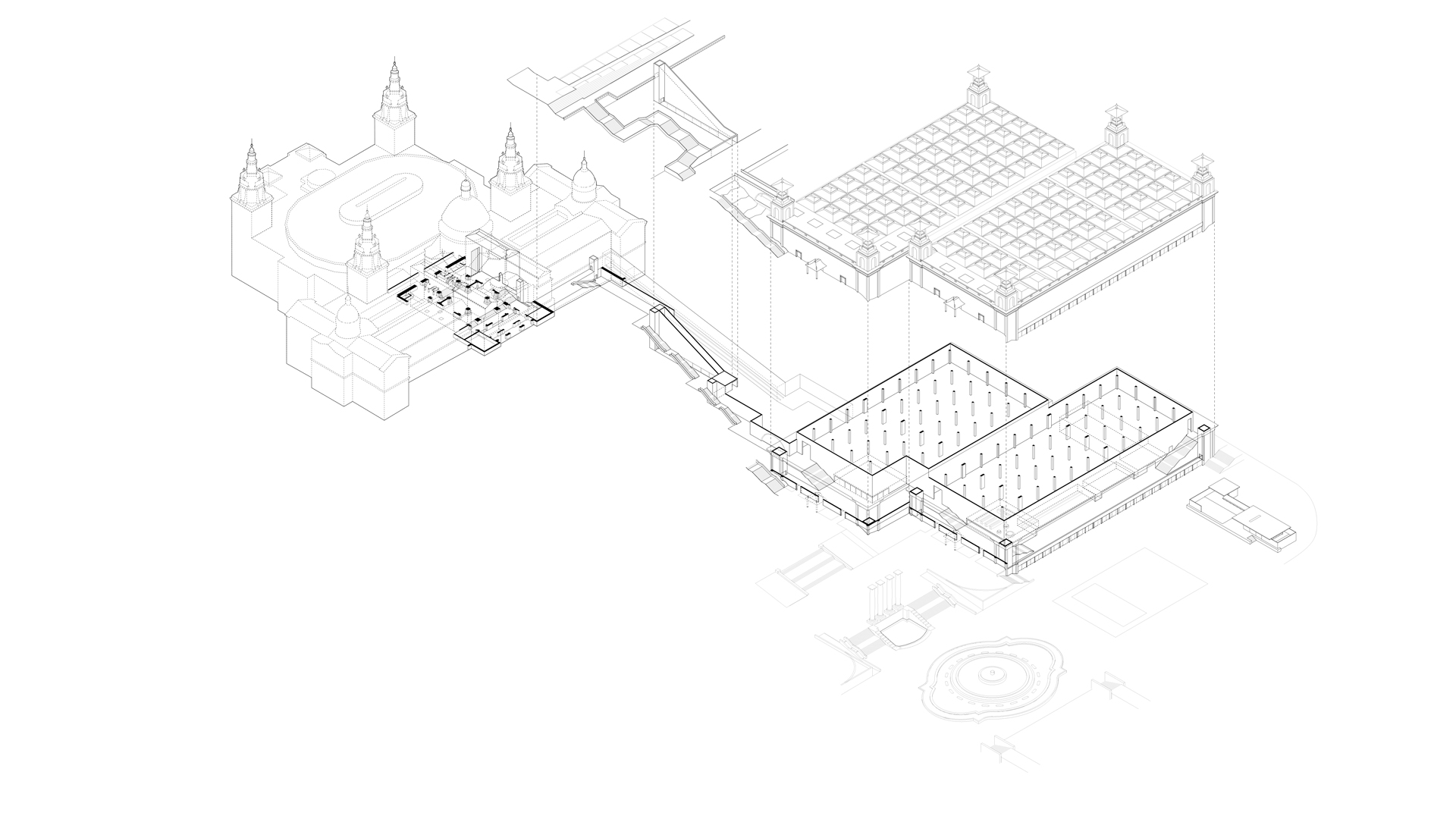Un passadís cobert connectarà els dos palaus, oferint una lectura unitària dels seus espais i enllaçant el hall d’accés del Palau Victòria Eugènia amb l’interior del Palau Nacional. Totalment accessible, el passadís esdevé un bulevard cobert que pot acollir usos independents, com auditori o espais comunitaris, alhora que facilita la connexió directa amb la trama urbana.